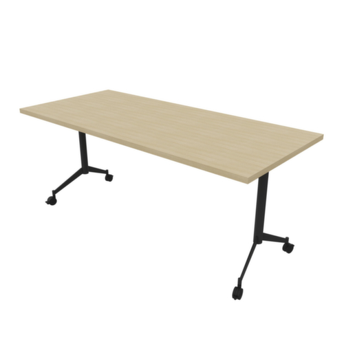 Zum Verstauen bei Nichtgebrauch kann die Tischplatte über die Griffstange um 90° gekippt werden. Plattenform eckig. T-Fußgestell aus Metall mit Epoxidpulverbeschichtung in dunkelgrau. Ovalrohr. 4 Rollen unter dem Gestell sorgen für die nötige Mobilität im Arbeitsalltag. Platte aus Holzwerkstoffplatte mit abriebfester und feuchtigkeitsbeständiger Melaminbeschichtung in Dekor Eiche. Plattenstärke 30 mm. Alle Kanten sind durch schlagfeste ABS-Umleimer vor unschönen Rissen und Ausbrechen geschützt. Ausgestattet mit Haken- und Verriegelungssystem zur frontalen und seitlichen Verbindung von Tischplatten.