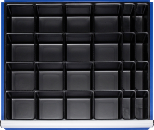 "longDescription": "Kleinteileeinsatz Höhe 45 mm zum Einsetzen in die Schublade. Mit 24 Fächern (16 x B128xT128 mm und 8 x B60xT128 mm).,Hinweis: Eine Anti-Rutsch-Matte kann zusätzlich verwendet/eingelegt werden. Das Einteilungsset kann auch für die Fronthöhen 120 bis 360 mm eingesetzt werden.,Qualitätsgarantie 5 Jahre,Made in Germany<br>",