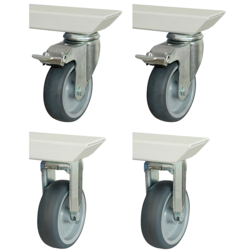 "longDescription": "<h2>Rollensatz</h2><strong>spurlos und bodenschonend</strong><br><ul><li><strong>Geringer Anfahrwiderstand</strong> - Rad mit thermoplastischer Gummi-Bereifung</li><li><strong>Sichere Ausstattung</strong> - Lenkrollen mit Feststeller</li></ul>",