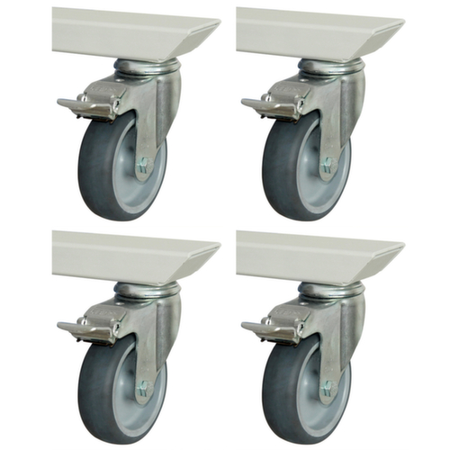"longDescription": "<h2>Rollensatz</h2><strong>spurlos und bodenschonend</strong><br><ul><li><strong>Geringer Anfahrwiderstand</strong> - Rad mit thermoplastischer Gummi-Bereifung</li><li><strong>Sichere Ausstattung</strong> - Lenkrollen mit Feststeller</li></ul>",