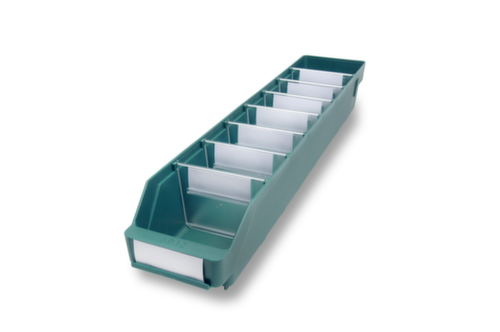 Aus bruchsicherem Polypropylen, in grün. Seitliche Nutenführungen und Bodenfixierungen ermöglichen das Einstecken von Querteilern und erlauben somit eine individuelle Kasten-Unterteilung. Sichtöffnung. Mit Etikettierfläche. Temperaturbeständig von -20 °C bis +80 °C. Material Lebensmittelgeeignet.