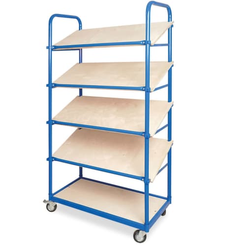 "metaDescription": "Regalwagen mit Schrägböden - Traglast 250 kg, 5 Etagen mit Holzböden, mit unterschiedlichem Unterbau",