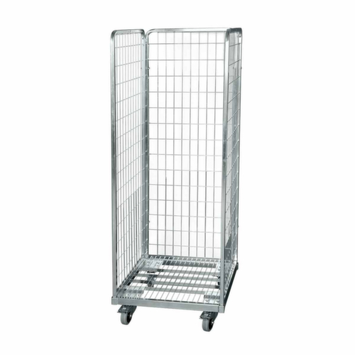 Aufbauten: 3 Wände (Drahtgitter). Konstruktion aus Stahl galvanisch blau verzinkt. Plattform aus Drahtgitter. Leicht zu manövrieren und verfahren durch 4 Lenkrollen. Rad Ø 100 mm. Mit bodenschonender Elastik-Bereifung. Naben mit für den Dauerbetrieb geeignetem Kugellager. Die Feststeller an 2 Lenkrollen gewähren einen sicheren Stand.