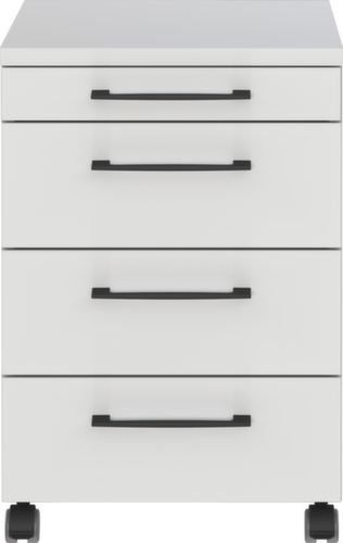 Konstruktion aus Holz. Der Rollcontainer bietet mit 1 Materialauszug und 3 Schubladen praktischen Stauraum direkt am Arbeitsplatz. Arbeitsmaterial, Unterlagen und auch Kleinteile, wie Stifte und Textmarker, sind ordentlich untergebracht und doch immer schnell griffbereit. Mit Bügelgriff aus Metall in schwarz.