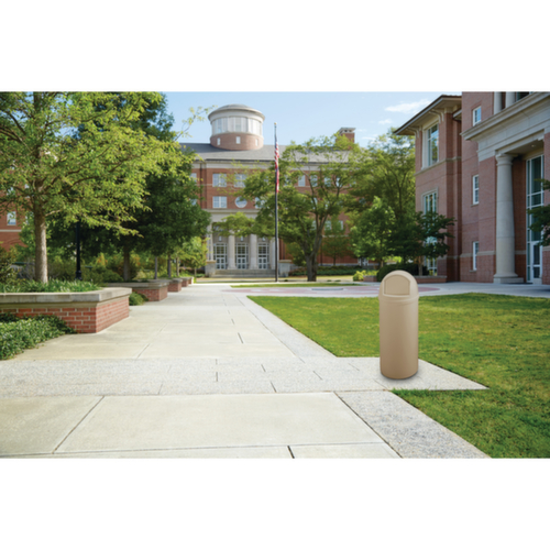Der Entsorgungsbehälter ist feuerhemmend - bei aufgesetztem Kopfteil und geschlossener Einwurfklappe werden Flammen erstickt. Für den Einsatz im Innen- und geschützten Außenbereich.