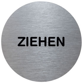 "metaDescription": "Rundes Türschild Tello, \"Ziehen\" - Ziehen, Alu, silber/schwarz, selbstklebend, Ø 70mm",
