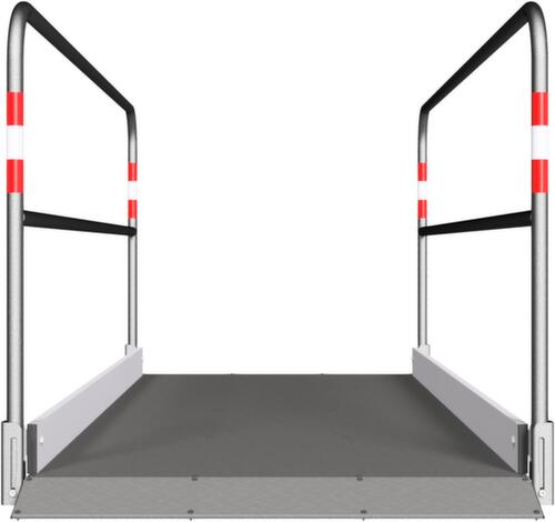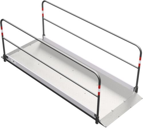 Die wichtigsten Maße auf einen Blick:Gestell aus Stahl mit korrosionsschützender Zinkbeschichtung. Trittfläche aus Aluminium mit rutschfestem Tränenblech. Ausgestattet mit Auffahrrampe und reflektierenden Seitengeländern. Beide Geländer sind für den platzsparenden Transport und Lagerung umlegbar.
