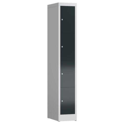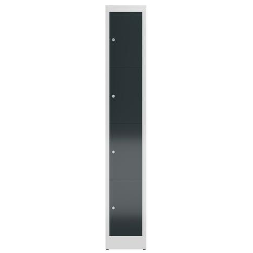 Flügeltür. Verschließbar mit Zylinderschloss. Konstruktion aus Stahl, verschweißt. Korpus mit elektrostatischer Pulverbeschichtung in RAL7035 Lichtgrau. Front mit elektrostatischer Pulverbeschichtung in RAL7016 Anthrazitgrau.