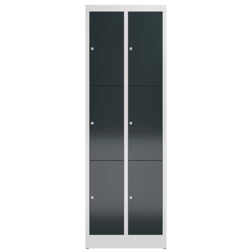 Flügeltür. Verschließbar mit Zylinderschloss. Konstruktion aus Stahl, verschweißt. Korpus mit elektrostatischer Pulverbeschichtung in RAL7035 Lichtgrau. Front mit elektrostatischer Pulverbeschichtung in RAL7016 Anthrazitgrau.