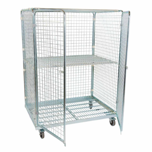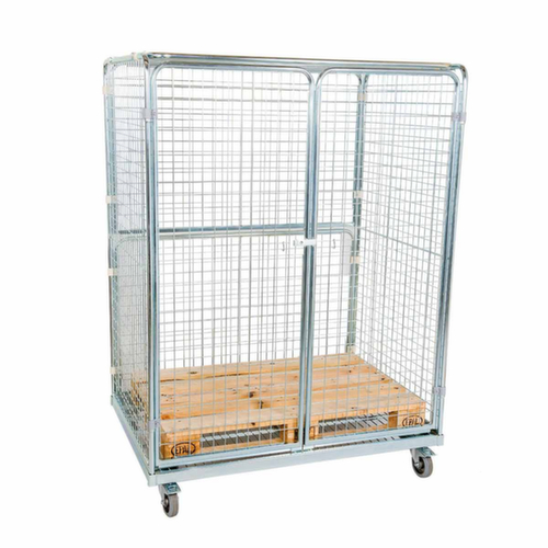Maßlich auf die Europalette abgestimmt. Aufbauten: 3 Wände (Drahtgitter), 1 Doppelflügeltür, Dach. Verschließbar mit Vorhängeschloss. Gestell aus Stahl galvanisch blau verzinkt. Plattform aus Drahtgitter. Leicht zu manövrieren und verfahren durch 4 Lenkrollen. Die Feststeller an 2 Lenkrollen gewähren einen sicheren Stand. Rad Ø 125 mm. Mit bodenschonender Elastik-Bereifung auf Aluminium-Felge.