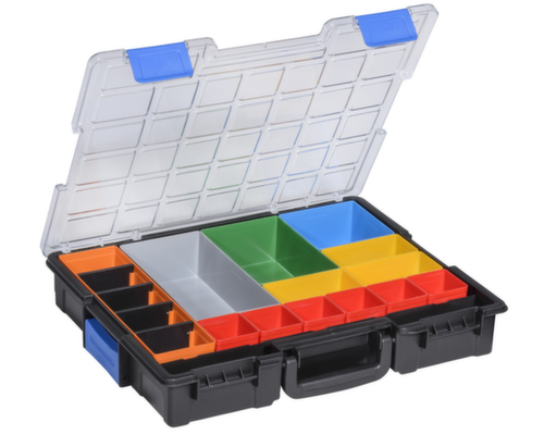 "longDescription": "<h2>Sortimentskoffer für Kleinteile mit 18 Fächern</h2><p>Der Sortimentskoffer für Kleinteile ist die geeignete Lösung, um kleine Gegenstände wie Schrauben, Muttern oder andere Kleinteile übersichtlich und sicher zu lagern. Erhältlich in 7 verschiedenen Varianten mit einer Fächeranzahl zwischen 8 und 36, bietet er Ihnen eine flexible Möglichkeit zur Organisation verschiedener Kleinteile. Ob im handwerklichen Bereich, in der Werkstatt oder für den Hobbygebrauch - der Koffer passt sich Ihren Bedürfnissen optimal an. Flexibler und robuster Sortimentskoffer Dank der herausnehmbaren Einsätze können Sie die Fächerstruktur des Koffers individuell gestalten und an die Größe der gelagerten Teile anpassen. Der Deckel aus hochschlagfestem Polycarbonat schützt den Inhalt zuverlässig und sorgt gleichzeitig für Langlebigkeit. Optimal ist der transparente Deckel, der Ihnen jederzeit einen schnellen Überblick über den Inhalt bietet - so wissen Sie immer, was wo gelagert ist. Sichere Verriegelung und bequemer Transport Der Koffer ist mit einem innovativen Verbindungsverschluss ausgestattet, der für eine sichere Verriegelung sorgt und ein unbeabsichtigtes Öffnen verhindert. Zudem verhindert der fest schließende Deckel, dass sich der Inhalt vermischt. Mithilfe des ergonomischen, klappbaren Griffs lässt sich der Koffer einfach transportieren. Erweiterbar und kompatibel Der Sortimentskoffer ist nicht nur flexibel in der Innenaufteilung, sondern kann auch mithilfe der Adapter-Platte aus dem passenden Zubehör für Transport- und Aufbewahrungsboxen problemlos mit den Transport- und Aufbewahrungsboxen verbunden werden. Damit eignet sich der Sortimentskoffer hervorragend für den Einsatz in modularen Lagersystemen. Entdecken Sie mit diesem Sortimentskoffer eine robuste und vielseitige Lösung, um Ihre Kleinteile stets griffbereit und sicher organisiert zu lagern!</p><br>",