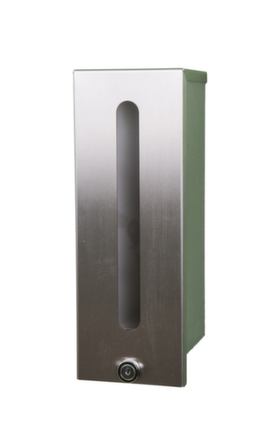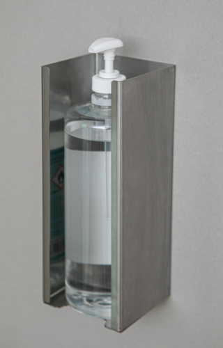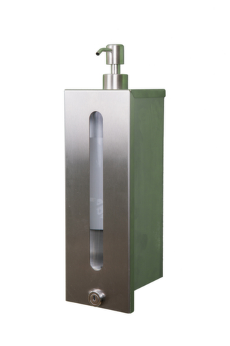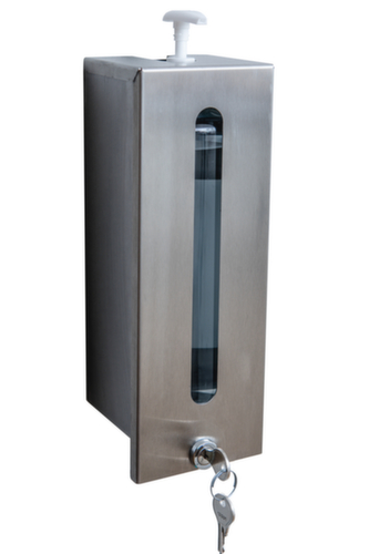 Geeignet für jegliche (alkoholhaltige) Desinfektionsmittel, Flüssig- und Cremeseife, Lotionen und ähnliche Flüssigkeiten. Mit Füllstandanzeige, Schloss. Verschließbar mit Sicherheitsschloss. Aus Edelstahl.