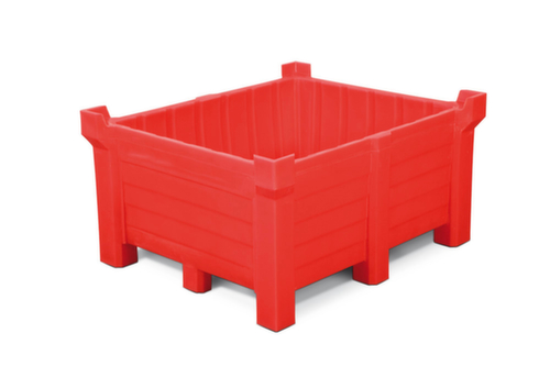 Die wichtigsten Maße des Stapelbehälters auf einen Blick:Aus schlagfestem Polyethylen in rot. Wände geschlossen, Boden geschlossen. Stapelecken sicher 5-fach stapelbar.