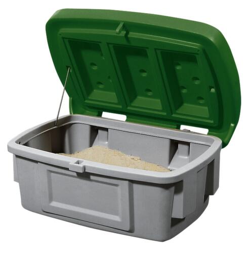 Aus schlagfestem Polyethylen. Ausgestattet mit schnell und einfach demontierbarem Klappdeckel - ganz ohne Werkzeug. Abschließbar: dank Einhängekonstruktion an Deckel und Korpus kann wahlweise bequem ein Vorhängeschloss angebracht werden. So ist stets ein Schutz vor unbefugtem Zugriff erreichbar. Behälter grau, Deckel grün. Wände geschlossen - als Ausführung ohne Entnahmeöffnung. Dies trägt zu zusätzlicher Robustheit des Sammelbehälters bei. Boden geschlossen. Mit offenem Deckel ineinander stapelbar.
