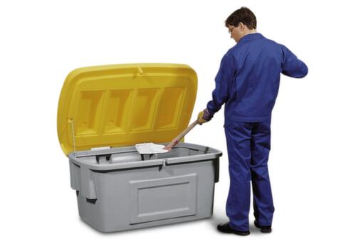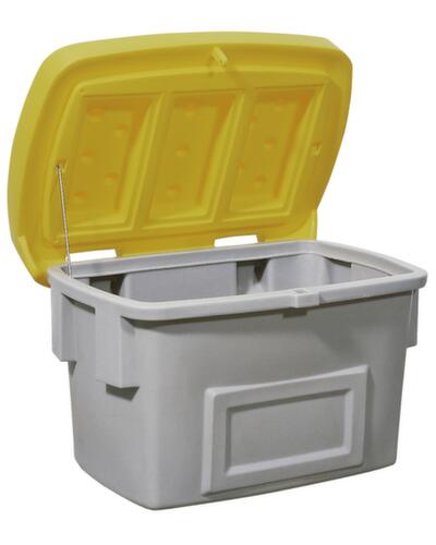Aus schlagfestem Polyethylen. Ausgestattet mit schnell und einfach demontierbarem Klappdeckel - ganz ohne Werkzeug. Abschließbar: dank Einhängekonstruktion an Deckel und Korpus kann wahlweise bequem ein Vorhängeschloss angebracht werden. So ist stets ein Schutz vor unbefugtem Zugriff erreichbar. Behälter grau, Deckel gelb. Wände geschlossen - als Ausführung ohne Entnahmeöffnung. Dies trägt zu zusätzlicher Robustheit des Sammelbehälters bei. Boden geschlossen. Mit offenem Deckel ineinander stapelbar.