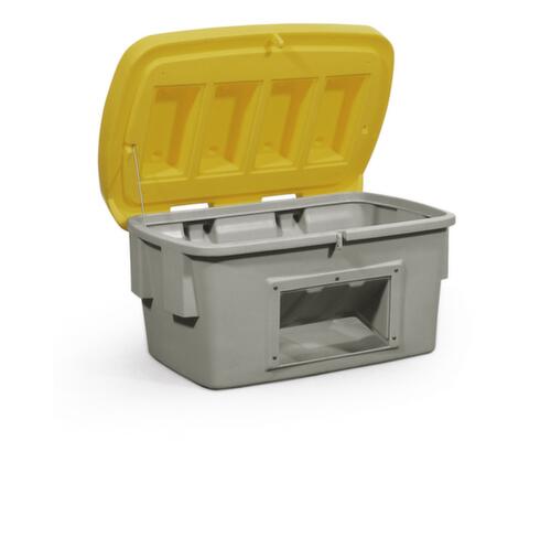 Aus schlagfestem Polyethylen. Ausgestattet mit schnell und einfach demontierbarem Klappdeckel - ganz ohne Werkzeug. Abschließbar: dank Einhängekonstruktion an Deckel und Korpus kann wahlweise bequem ein Vorhängeschloss angebracht werden. So ist stets ein Schutz vor unbefugtem Zugriff erreichbar. Behälter grau, Deckel gelb. Wände geschlossen mit praktischer Entnahmeöffnung. Dadurch lässt sich Material einfach entnehmen, ganz ohne dass der Deckel geöffnet werden muss. Boden geschlossen. Mit offenem Deckel ineinander stapelbar.