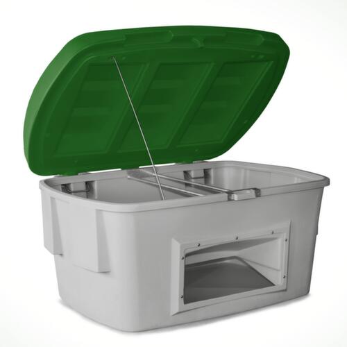 Aus schlagfestem Polyethylen. Ausgestattet mit schnell und einfach demontierbarem Klappdeckel - ganz ohne Werkzeug. Abschließbar: dank Einhängekonstruktion an Deckel und Korpus kann wahlweise bequem ein Vorhängeschloss angebracht werden. So ist stets ein Schutz vor unbefugtem Zugriff erreichbar. Behälter grau, Deckel grün. Wände geschlossen mit praktischer Entnahmeöffnung. Dadurch lässt sich Material einfach entnehmen, ganz ohne dass der Deckel geöffnet werden muss. Boden geschlossen. Mit offenem Deckel ineinander stapelbar.