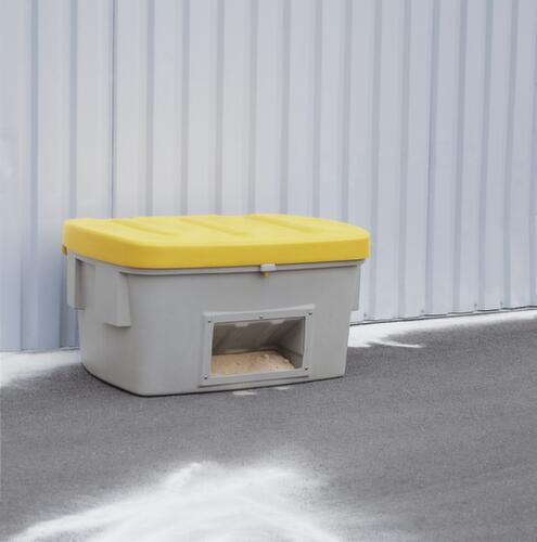 Aus schlagfestem Polyethylen. Ausgestattet mit schnell und einfach demontierbarem Klappdeckel - ganz ohne Werkzeug. Abschließbar: dank Einhängekonstruktion an Deckel und Korpus kann wahlweise bequem ein Vorhängeschloss angebracht werden. So ist stets ein Schutz vor unbefugtem Zugriff erreichbar. Behälter grau, Deckel gelb. Wände geschlossen mit praktischer Entnahmeöffnung. Dadurch lässt sich Material einfach entnehmen, ganz ohne dass der Deckel geöffnet werden muss. Boden geschlossen. Mit offenem Deckel ineinander stapelbar.Bitte beachten Sie: Die Abbildung ist dem Produkt ähnlich.