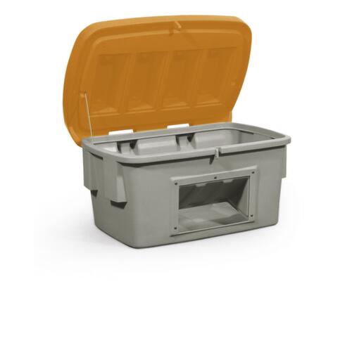 Aus schlagfestem Polyethylen. Ausgestattet mit schnell und einfach demontierbarem Klappdeckel - ganz ohne Werkzeug. Abschließbar: dank Einhängekonstruktion an Deckel und Korpus kann wahlweise bequem ein Vorhängeschloss angebracht werden. So ist stets ein Schutz vor unbefugtem Zugriff erreichbar. Behälter grau, Deckel orange. Wände geschlossen mit praktischer Entnahmeöffnung. Dadurch lässt sich Material einfach entnehmen, ganz ohne dass der Deckel geöffnet werden muss. Boden geschlossen. Mit offenem Deckel ineinander stapelbar.