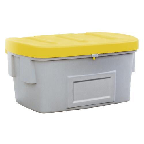 Aus schlagfestem Polyethylen. Ausgestattet mit schnell und einfach demontierbarem Klappdeckel - ganz ohne Werkzeug. Abschließbar: dank Einhängekonstruktion an Deckel und Korpus kann wahlweise bequem ein Vorhängeschloss angebracht werden. So ist stets ein Schutz vor unbefugtem Zugriff erreichbar. Behälter grau, Deckel gelb. Wände geschlossen - als Ausführung ohne Entnahmeöffnung. Dies trägt zu zusätzlicher Robustheit des Sammelbehälters bei. Boden geschlossen. Mit offenem Deckel ineinander stapelbar.