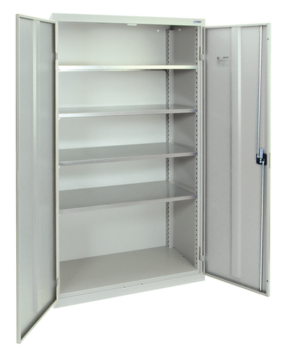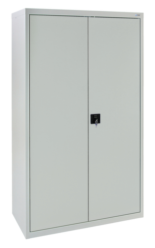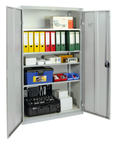 Aus Qualitätsfeinblech gefertigt. Hohe Flexibilität der Inneneinrichtung durch Verstellbarkeit der Fachhöhen im Raster von 25 mm. Ausgestattet mit Böden. Über die Doppelflügeltür ist der Zugriff auf den Schrankinhalt besonders komfortabel. Verschließbar mit robustem Drehgriff-Zylinderschloss. Griff und Schloss in einem für eine einfaches und schnelles Öffnen und Schließen. Die 3-Punkt-Verriegelung bietet hohe Stabilität und einen effektiven Einbruchschutz.
