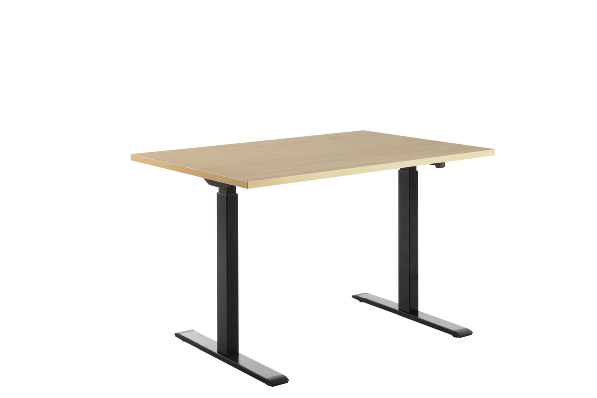Platte aus Spanplatte mit pflegeleichter Melaminharzbeschichtung in Dekor Ahorn. Plattenform rechteckig. T-Fußgestell in schwarz. Höhenverstellung durch 2 Elektromotoren unterstützen Sie bei einer komfortablen Höhenverstellung auf Knopfdruck. Funktionen: Abspeichern und automatisches Abrufen von programmierten Tischhöhen dank Memoryfunktion. Der automatische Kollisionsschutz stoppt sofort bei Widerstand von oben oder unten und sorgt somit für absolute Sicherheit.