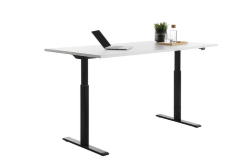 Platte aus Spanplatte mit pflegeleichter Melaminharzbeschichtung in Dekor weiß. Plattenform rechteckig. T-Fußgestell in schwarz. Höhenverstellung durch 2 Elektromotoren unterstützen Sie bei einer komfortablen Höhenverstellung auf Knopfdruck. Funktionen: Abspeichern und automatisches Abrufen von programmierten Tischhöhen dank Memoryfunktion. Der automatische Kollisionsschutz stoppt sofort bei Widerstand von oben oder unten und sorgt somit für absolute Sicherheit.