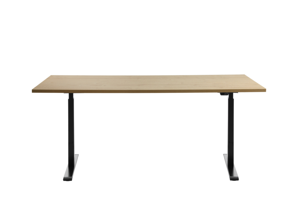Platte aus Spanplatte mit pflegeleichter Melaminharzbeschichtung in Dekor Ahorn. Plattenform rechteckig. T-Fußgestell in schwarz. Höhenverstellung durch 2 Elektromotoren unterstützen Sie bei einer komfortablen Höhenverstellung auf Knopfdruck. Funktionen: Abspeichern und automatisches Abrufen von programmierten Tischhöhen dank Memoryfunktion. Der automatische Kollisionsschutz stoppt sofort bei Widerstand von oben oder unten und sorgt somit für absolute Sicherheit.