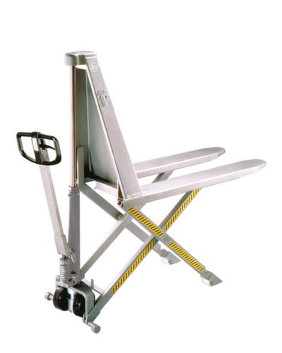 "longDescription": "<h2>BT High Lifter Scherenhubwagen</h2><strong>Traglast 1000 kg</strong><br><ul><li>Aus Edelstahl mit glasperlgestrahlter Oberfläche</li><li>Ergonomisch abgewinkelter und temperaturfreundlich ummantelter Deichselgriff</li><li>Die Spezialhydraulik mit Senkkontrolle ist zwischen Handhebel und Ablassventil mit einer Kette verbunden</li><li>In Verbindung mit dem kräftigen Drucklager ist ein kontrolliertes Heben und Senken und ein kraftschonendes Rangieren gewähleistet</li><li>Stützen vor den Rollen erhöhen die Standsicherheit bei angehobener Last</li><li>Einstellbare Stabilisatoren ermöglichen einen sicheren Stand</li><li>Durch Quick-Lift-Hub erreicht die Gabel die Palette schon mit dem ersten Pumpenhub und hebt diese mit dem zweiten Pumpenhub an</li><li>Wirkt bis zu einer Last von 250 kg und schaltet bei höherer Last automatisch auf Standard-Hub um</li></ul><br><h3>Rollen:</h3><ul><li>Lenkräder Polyurethan, Gabelrollen Nylon, einfach</li><li>Lenkräder Ø x B = 175 x 58 mm</li><li>Gabelrollen Ø x B = 75 x 77 mm</li></ul>",