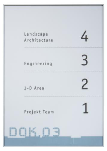 "longDescription": "<h2>TĂŒrschild</h2><strong>zur erleichterten Orientierung</strong><br><ul><li><strong>Absolute FlexibilitĂ€t</strong> dank leicht zu wechselnder Papiereinlagen</li><li><strong>Schutz vor Staub</strong> - Scheibe aus Acrylglas</li><li><strong>Zeitlos und robust</strong> - Rahmen aus hochfesten Aluminiumprofilen</li></ul><br><strong>Gut zu wissen!</strong><br><br>Um die Beschriftung der Schilder noch einfacher zu machen, bestellen Sie direkt die Gestaltungs-Software und die passenden Einlagen mit!<br>",