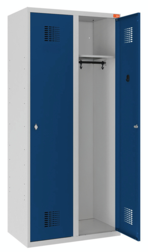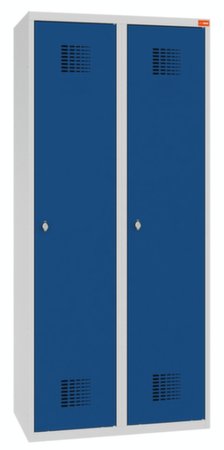 Je Abteil 1 Hutboden, 1 Kleiderstange mit 2 Haken, Spiegel in der Tür. Flügeltür mit Etikettenrahmen. Die aufschlagenden Türen bieten den Vorteil, dass es im Schrank keinerlei Platzverlust gibt, da sie innerhalb des Schrankes keinen Platz einnehmen. Verschließbar mit Drehriegelverschluss. Die standardisierte WEMO-Perforation sorgt für optimale Luftzirkulation im Schrank. Der untergebaute Sockel sorgt dafür, dass das Gewicht des Schrankes gleichmäßig auf dem Boden verteilt wird. Dies erhöht die Stabilität und der Schrank kann schwerer Lasten aufnehmen, als ein Schrank mit Füßen. Außerdem können Schmutz, Staub und Feuchtigkeit nicht unter den Schrank gelangen, was die Reinigungsfläche verkleinert. Konstruktion aus Stahlblech. Korpus mit korrosionsfester Zirkoniumbeschichtung in RAL7035 Lichtgrau, Front mit korrosionsfester Zirkoniumbeschichtung in RAL5010 Enzianblau.
