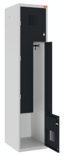 Je Abteil 1 Kleiderstange mit 2 Doppelhaken und 1 Einlegeboden pro Fach. Z-Flügeltür mit Etikettenrahmen und Lüftungsschlitzen. Verschließbar mit Drehriegelverschluss. Die standardisierte WEMO-Perforation sorgt für optimale Luftzirkulation im Schrank. Konstruktion aus Stahlblech. Korpus mit korrosionsfester Zirkoniumbeschichtung in RAL7035 Lichtgrau, Front mit korrosionsfester Zirkoniumbeschichtung in RAL7016 Anthrazitgrau.