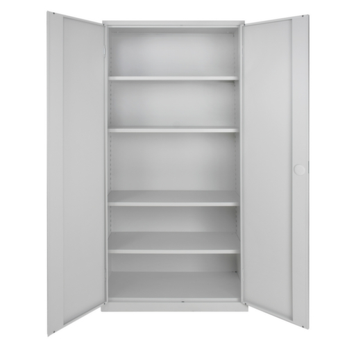 Die wichtigsten Maße des Universalschrankes auf einen Blick:Aus Stahl gefertigt. Hohe Flexibilität der Inneneinrichtung durch Verstellbarkeit der Fachhöhen im Raster von 25 mm. Ausgestattet mit Böden. Über die Doppelflügeltür ist der Zugriff auf den Schrankinhalt besonders komfortabel. Die einschlagenden Türen schließen bündig mit dem Korpus ab und bieten so keine hervorstehenden Kanten an denen man sich stoßen kann oder sich Staub ablagert. Jede Tür ist serienmäßig mit geräuschdämpfenden Gummipuffern ausgestattet, sodass auch beim schwungvollen Schließen die Tür nicht zuknallt. Dies sorgt für eine angenehme Geräuschkulisse und schont gleichzeitig den Schrank vor Beschädigungen. Verschließbar mit Schubstangenverschluss mit Zylinderschloss. Die 2-Punkt-Sicherheitsverriegelung bietet hohe Stabilität und einen effektiven Einbruchschutz.