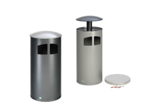 "description": "HxØ 1110x445mm, 75l, z. Aufdübeln, Korpus Stahl silber, Säulenform, m. Schutzdach",
