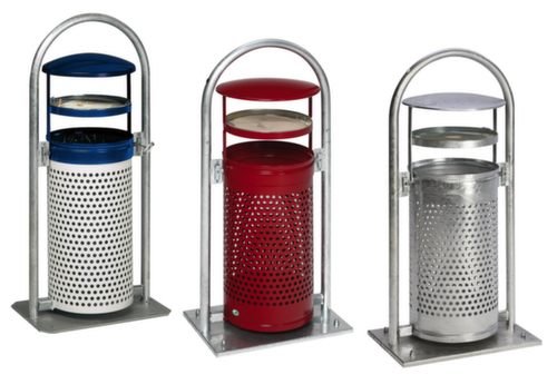 "metaDescription": "VAR Abfallbehälter RB 002 mit Rohrbogen und Ascher mit Schutzdach - 65 l, HxBxT 1080x580x380 mm, in verschiedenen Farben",