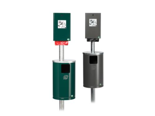 "description": "f. außen, Abfallbehälter 30l, f. 200 Beutel, HxBxT 2000x350x480mm, Korpus Stahl moosgrün",