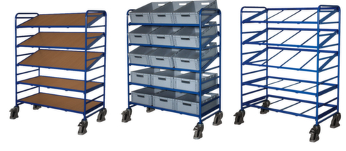 "description": "Tragl. 250kg, 5 Etage(n), Stahlplatte, m. Winkelrahmen, neigbar, m. 15 Kästen, Euronorm, RAL5010, TPE-Bereifung",