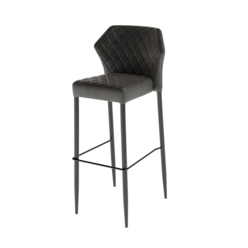 Sitz aus Kunstleder. Sitz und Rücken gepolstert. Sitzbezug aus Kunstleder (65% Harz, 35% Gewebe) in schwarz. Rückenlehne mit Kassettensteppung. Rückenbezug aus Kunstleder (65% Harz, 35% Gewebe) in schwarz. Ausgestattet mit Fußring. Gestell aus Stahl mit schlag- und kratzfester Pulverbeschichtung in schwarz. Der Bezugstoff ist feuerhemmend. Platzsparend 8-fach stapelbar.