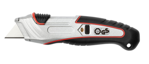 "longDescription": "<h2>Safety Cutter</h2><strong>mit automatischem Klingenrückzug </strong><br><ul><li>Für Rechts- und Linkshänder geeignet</li><li>Ergonomisch geformter Metallgriff mit gummierter Griffzone </li><li>Klinge federbelastet mit automatischem Klingenrückzug, sobald sie keinen Kontakt mehr mit dem Schneidegut hat</li><li>Mit Einstellrad, Schnitttiefe in 3 Stufen wählbar: 9 mm, 15 mm und 25 mm</li><li>Einfacher Klingenwechsel mit Sicherungsriegel</li><li>Mit Aufhängeloch</li></ul><br><h3>Lieferumfang:</h3><ul><li>Inkl. 5 Trapez-Ersatzklingen aus SK5-Carbonstahl</li></ul><br><h3>Prüfzeichen / Geprüft nach:</h3><ul><li>GS-Zeichen - TÜV geprüft</li></ul>",