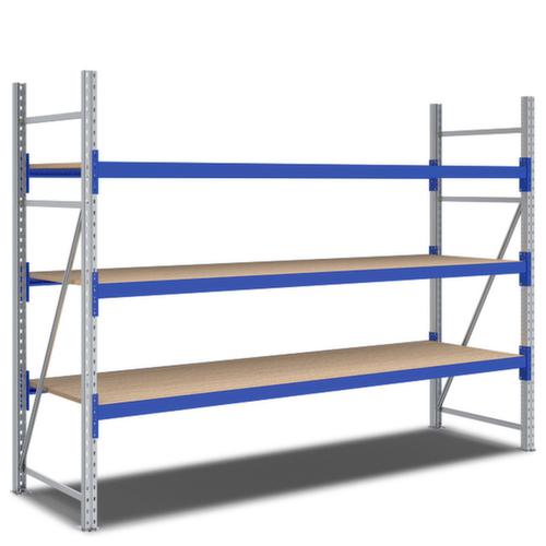 Die wichtigsten Maße des Weitspannregals auf einen Blick:3 Ebene(n) mit Holzboden. Fachhöhen je nach Einsatzzweck und Ihrem Bedarf im Raster von 50 mm verstellbar. Konstruktion aus Stahl, Ständer mit korrosionsschützender Zinkbeschichtung, Traversen mit strapazierfähiger Kunststoffbeschichtung in RAL5010 Enzianblau. Ständer mit Fußplatte (dübelfähig).