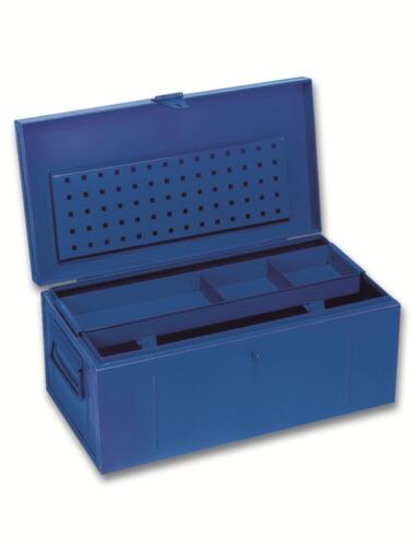 Ausstattung: herausnehmbarer Kleinteileeinsatz. Aus Stahl mit schlag- und kratzfester Pulverbeschichtung in RAL5002 Ultramarinblau. Verschließbar mit Deckel mit Innenfach, mit Vorhängeschloss. Einfach zu tragen durch Tragegriffe.