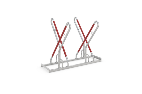 Nutzung beitseitig - durch die gekreuzte Konstruktion der Bügel können zwei gegenüberstehende Fahrräder platzsparend geparkt werden. Konstruktion aus Stahl (verschraubt) mit korrosionsschützender Zinkbeschichtung. Rundrohrkonstruktion. Mit extra hohem Stellbügel, der nicht nur für größere Fahrräder geeignet ist, sondern auch zum gesundheitsschonenden Abschließen ohne Körperbeugung beiträgt. Ausgestattet mit Stahlösen als Diebstahlsicherung und Kunststoffummantelung als Anschlagschutz. Ständer vorbereitet zur Reihenverbindung. Zur Bodenmontage.