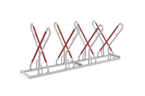 Nutzung beitseitig - durch die gekreuzte Konstruktion der Bügel können zwei gegenüberstehende Fahrräder platzsparend geparkt werden. Konstruktion aus Stahl (verschraubt) mit korrosionsschützender Zinkbeschichtung. Rundrohrkonstruktion. Mit extra hohem Stellbügel, der nicht nur für größere Fahrräder geeignet ist, sondern auch zum gesundheitsschonenden Abschließen ohne Körperbeugung beiträgt. Ausgestattet mit Stahlösen als Diebstahlsicherung und Kunststoffummantelung als Anschlagschutz. Ständer vorbereitet zur Reihenverbindung. Zur Bodenmontage.