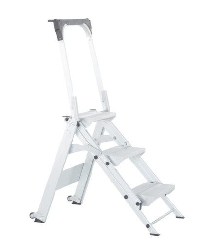 "metaDescription": "ZARGES Klappbare Sicherheitstreppe Plazastep P aus Leichtmetall - einseitig, 3 Stufen, Stand H 0,66m, Leichtmetall",
