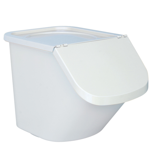 Aus bruchsicherem Polypropylen. Behälter in weiß und Deckel in weiß. Wände: glatte, nahtlose Flächen für eine leichte Reinigung. Geeignet für Schüttgüter aller Art. Verschließbar mit Klappdeckel. Der Deckel lässt sich auch öffnen, wenn mehrere Boxen aufeinander gestapelt sind. Der Behälterinhalt lässt sich dank der abgeschrägten Eingrifföffnung leicht entnehmen. Lebensmittelgeeignet.